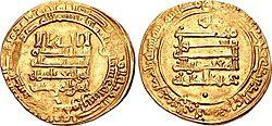 From the early 10th century, the form al-Dawla began appearing as a compound in honorific titles granted by the caliphs to their senior-most courtiers, beginning with the vizier al-Qasim ibn Ubayd Allah ibn Wahb, who was granted the title of Wali al-Dawla ("Friend of the Dynasty") by the caliph al-Muktafi (r. 902–908), an epithet which also appeared on caliphal coinage.[3] The same honour was also bestowed on al-Qasim's son, al-Husayn, who was named Amid al-Dawla ("Support of the Dynasty") by al-Muqtadir in February 932.[3]