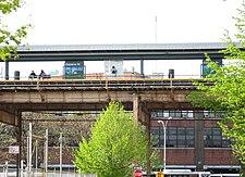 A trackway starts at the top of the station's flat canopy and runs to the elevated complex at Broadway Junction. This track was intended to be an express track, with work beginning on the proposed express track in the late 1960s.[12] However, engineering studies completed after the work started indicated that the vibration of trains passing over the stations would be too severe and would literally shake the stations apart.