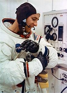 Bean was selected by NASA as part of Astronaut Group 3 in 1963 (after not being selected for Astronaut Group 2 the previous year).[12] He was selected to be the backup command pilot for Gemini 10, but was unsuccessful in securing an early Apollo flight assignment. He was placed in the Apollo Applications Program in the interim. In that capacity, he was the first astronaut to dive in the Neutral Buoyancy Simulator and a champion of the process for astronaut training.[13] When fellow astronaut Clifton Williams was killed in an air crash, a space was opened for Bean on the backup crew for Apollo 9. Apollo 12 Commander Conrad, who had instructed Bean at the Naval Flight Test School years before, personally requested Bean to replace Williams.[10]