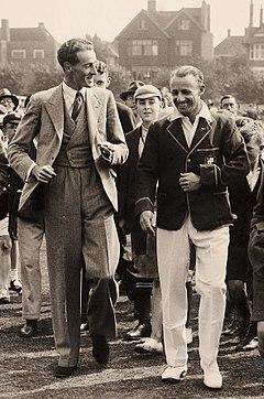 Melville himself took a while to adapt to Test cricket. He was out without scoring in the only innings of the first game, one of five ducks in an innings of 390.[21] For the second match, he demoted himself from No 3 in the batting order to No 9 and scored 23 in his only innings.[22] For the third match, he went in at No 8 and scored 5 not out and 10.[23] Respite for Melville from this series of mediocre personal performances with a match for a Combined Transvaal XI against the MCC touring team immediately after the third Test defeat. Though he scored only 1 in the first innings, he resorted to opening the batting in the second innings and scored 107 "cutting, driving and hooking with effortless ease", Wisden reported.[24][25] That led him to open the South African innings in the fourth Test and he and van der Bijl – his collision partner from Oxford in 1932 – put on an opening partnership of 108 before Melville was out for 67.[26] Rain had spoiled the possibility of a South African victory in the fourth game, but the fifth match was due to be played to a finish, South Africa attempted to win through sheer weight of runs: the first innings lasted two-and-a-half days and totalled 530. Van der Bijl and Melville improved on their first-wicket stand in the first innings, scoring 131 before Melville was out for 78. After bowling England out for 316, Melville did not enforce the follow-on and the South Africans in their second innings scored 481; Melville himself had an injured thigh and this time came in at No 6 but scored 103, his first Test century. Despite the heavy scoring the match was left drawn after the 10th day when the England team, having scored 654 for five wickets in pursuit of a victory target of 696, were forced to leave the match as a draw to catch their ship home.[2][27]