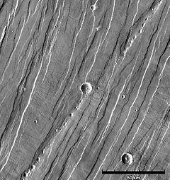 Most of the central edifice of Alba Mons is mantled with a layer of dust approximately 2 m (6.6 ft) thick.[27][28] The dust layer is visible in high resolution images of the summit (pictured right). In places, the dust has been carved into streamlined shapes by the wind and is cut by small landslides. However, some isolated patches of dust appear smooth and undisturbed by the wind.[29]