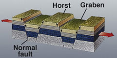 Alba's tectonic features are almost entirely extensional,[51] consisting of normal faults, graben and tension cracks. The most common extensional features on Alba Mons (and Mars in general) are simple graben. Graben are long, narrow troughs bound by two inward-facing normal faults that enclose a downfaulted block of crust (pictured right). Alba has perhaps the clearest display of simple graben on the entire planet.[52] Alba's graben are up to 1,000 km (620 mi) long, and have a width on the order of 2 km (1.2 mi)–10 km (6.2 mi), with depths of 100 m (330 ft)–350 m (1,150 ft).[53]