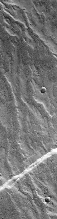 In addition to the two main types of flows, numerous undifferentiated flows are present around Alba Mons that are either too degraded to characterize or have hybrid characteristics. Flat-topped ridges with indistinct margins and rugged surfaces,[9][36] interpreted as lava flows, are common along Alba's lower flanks and become less sharp in appearance with increasing distance from the edifice.[11] In high resolution images, many of the flows on the volcano's upper flanks originally characterized as sheet flows have central channels with levee-like ridges.[42]