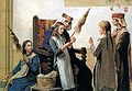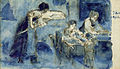 During his studies, Anker produced a series of works with historical and biblical themes, including paintings of Luther and Calvin.[1] Soon after returning to Ins, though, he turned to what would become his signature theme: the everyday life of people in rural communities. His paintings depict his fellow citizens in an unpretentious and plain manner, without idealising country life, but also without the critical examination of social conditions that can be found in the works of contemporaries such as Daumier, Courbet or Millet.[1] Although Anker did paint occasional scenes with a social significance, such as visits by usurers or charlatans to the village, his affirmative and idealistic Christian world-view did not include an inclination to issue any sort of overt challenge.[1]