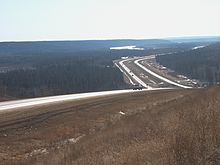 Predicated on the rapid development of the Athabasca oil sands in the 1960s, construction of Highway 63 lagged decades behind the other major highways in Alberta that now form core routes of the National Highway System.[26] By the 1930s, roads of varying quality had been constructed along the approximate alignments of present-day Highways 1, 2, 3, 4 and 16, all paralleling existing railways.[26] Highway 63 was developed similarly, with construction of the Alberta and Great Waterways Railway (A&GW) completed by 1920.[27] It connected Edmonton to Waterways (now a neighbourhood of Fort McMurray) via Lac La Biche,[27] near the present-day alignment of Highway 881 and as many as 70 km (43 mi) east of the route that later became Highway 63 north of Boyle.[3][28] Prior to the railway, a common route from Edmonton to McMurray was for one to first reach Athabasca by rail, then travel north along the Athabasca and House Rivers before portaging into McMurray.[1]