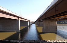 Extensive reconstruction of the Grant MacEwan Bridge was completed in December 2013, carrying two eastbound lanes over the river.[55] Prior to this reconfiguration, the MacEwan's two lanes carried all eastbound traffic but upon completion of this project it would serve only as an exit ramp for south/eastbound traffic accessing downtown, while the repurposed Steinhauer Bridge carried the main eastbound through traffic.[5] The reconstruction consisted of the demolition of the truss superstructure to make way for a modern girder design, while the existing piers were retained.[5] The piers were slightly shortened with the new bridge deck built on top; the new lanes veer left at the end of the bridge and descend into a short tunnel passing underneath the main eastbound and westbound lanes of Highway 63, connecting to Franklin Avenue downtown.[4] To access the bridge, southbound traffic exits the highway to the right several hundred meters before the river, immediately after Thickwood Boulevard. The two-lane ramp curves east alongside the main eastbound lanes and forms the two lanes of the MacEwan.[4]