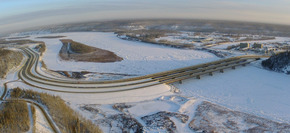 West of the river, Highway 63 and its brief collector-distributor system curve north to follow the Athabasca's west bank toward Fort McKay, passing the neighbourhood of Ross Haven en route to trumpet interchanges each at Thickwood Boulveard, Confederation Way, and Parsons Access Road, the last of which essentially marks the northern limit of Fort McMurray's residential development. The divided highway continues north alongside the river through boreal forest to Tar Island where it bends slightly northwest. The northbound and southbound lanes diverge as the highway passes between the Suncor Energy and Syncrude plants near Mildred Lake.[4] The two carriageways then rejoin and the highway becomes undivided, but 10 km (6.2 mi) later a brief 2 km (1.2 mi) divided section precedes a second crossing of the Athabasca River on the Peter Lougheed Bridge. The Fort McKay Road splits to the north from the divided section prior to the river, providing access to the community of Fort McKay. East of the river, Highway 63 curves north along the east bank to a point approximately 22 km (14 mi) north of Fort McKay near the Fort MacKay/Albian Aerodrome, where the highway designation ends at an intersection with a dirt road. The unnamed local paved road continues for another 4 km (2.5 mi) before becoming gravel.[4] In the winter months, it carries on north to Fort Chipewyan on the western shore of Lake Athabasca as a winter road through the Regional Municipality of Wood Buffalo, paralleling the Athabasca River.[6]