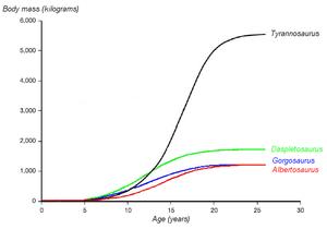 Most age categories of Albertosaurus are represented in the fossil record. Using bone histology, the age of an individual animal at the time of death can often be determined, allowing growth rates to be estimated and compared with other species. The youngest known Albertosaurus is a two-year-old discovered in the Dry Island bonebed, which would have weighed about 50 kilograms (110 lb) and measured slightly more than 2 metres (6.6 feet) in length. The 10 metres (33 feet) specimen from the same quarry is the oldest and largest known, at 28 years of age. When specimens of intermediate age and size are plotted on a graph, an S-shaped growth curve results, with the most rapid growth occurring in a four-year period ending around the sixteenth year of life, a pattern also seen in other tyrannosaurids. The growth rate during this phase was 122 kilograms (269 pounds) per year, based on an adult 1.3 tonnes. Other studies have suggested higher adult weights; this would affect the magnitude of the growth rate, but not the overall pattern. Tyrannosaurids similar in size to Albertosaurus had similar growth rates, although the much larger Tyrannosaurus rex grew at almost five times this rate (601 kilograms [1,325 pounds] per year) at its peak.[3] The end of the rapid growth phase suggests the onset of sexual maturity in Albertosaurus, although growth continued at a slower rate throughout the animals' lives.[3][12] Sexual maturation while still actively growing appears to be a shared trait among small[40] and large[41] dinosaurs as well as in large mammals such as humans and elephants.[41] This pattern of relatively early sexual maturation differs strikingly from the pattern in birds, which delay their sexual maturity until after they have finished growing.[19][41]