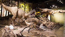 There is plentiful evidence for gregarious behaviour among herbivorous dinosaurs, including ceratopsians and hadrosaurs.[46] However, only rarely are so many dinosaurian predators found at the same site. Small theropods like Deinonychus[47] and Coelophysis[48] have been found in aggregations, as have larger predators like Allosaurus and Mapusaurus.[49] There is some evidence of gregarious behaviour in other tyrannosaurids as well. Fragmentary remains of smaller individuals were found alongside "Sue", the Tyrannosaurus mounted in the Field Museum of Natural History in Chicago, and a bonebed in the Two Medicine Formation of Montana contains at least three specimens of Daspletosaurus, preserved alongside several hadrosaurs.[50] These findings may corroborate the evidence for social behaviour in Albertosaurus, although some or all of the above localities may represent temporary or unnatural aggregations.[11] Others have speculated that instead of social groups, at least some of these finds represent Komodo dragon-like mobbing of carcasses, where aggressive competition leads to some of the predators being killed and cannibalized.[43]