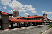 By 1900, Albuquerque boasted a population of 8,000 inhabitants and all the modern amenities, including an electric street railway connecting Old Town, New Town, and the recently established University of New Mexico campus on the East Mesa. In 1902, the famous Alvarado Hotel was built adjacent to the new passenger depot, and it remained a symbol of the city until it was razed in 1970 to make room for a parking lot. In 2002, the Alvarado Transportation Center was built on the site in a manner resembling the old landmark. The large metro station functions as the downtown headquarters for the city's transit department. It also serves as an intermodal hub for local buses, Greyhound buses, Amtrak passenger trains, and the Rail Runner commuter rail line.