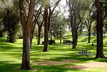 Albuquerque lies within the center of the Albuquerque Basin ecoregion, centered on the Rio Grande with its Bosque gallery forest, flanked easterly by the Sandia–Manzano Mountains and westerly by the West Mesa.[30][31] Located in central New Mexico, the city also has noticeable influences from the adjacent Colorado Plateau semi-desert, New Mexico Mountains forested with juniper and pine, and Southwest plateaus and plains steppe ecoregions, depending on where one is located.