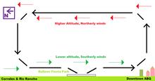 The success of the Fiesta depends in part on the cool Albuquerque morning temperatures in October and the Albuquerque box. The "box" is a set of predictable wind patterns that can be exploited to navigate the balloons. At low elevations the winds tend to be northerly (from the north), but at higher elevations they tend to be southerly.[11] Balloonists use these winds to navigate in a vertical box: they ascend slightly from the launch park, move south, ascend further, move north, descend, and repeat the box or land back in the launch park or quite nearby. During events involving on-field targets, such as the "Key Grab" (where pilots attempt to grab prizes, including a set of keys to a new vehicle, from atop tall, flexible poles), it's not uncommon to see the same balloon make 5 or 6 passes at the targets, simply by working the "Box" to keep returning to the field.