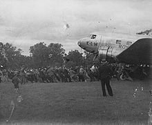 In 1934, a Douglas DC-2 airliner of KLM (the "Uiver"), a competitor in the MacRobertson Trophy Air Race (also known as the London to Melbourne Air Race), made an emergency night landing at the town's racecourse after becoming lost during severe thunderstorms. After signalling by Morse code A-L-B-U-R-Y to the lost aircrew by using the entire town's public lighting system, the "Uiver" was guided in to land safely. The makeshift runway at the racecourse was illuminated by the headlights of cars belonging to local residents who had responded to a special news bulletin on ABC radio station 2CO. After refuelling the next day, many local volunteers helped pull the stranded aircraft out of the mud and the aircraft was able to take off and continue to Melbourne where it won first prize in the race's handicap category and was second overall.[12][13]