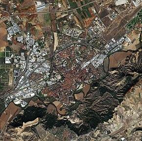 Alcalá de Henares is located in the central part of the Iberian Peninsula, in the southern half of the Inner Plateau. It lies on the valley of the Henares, a left-bank tributary of the Jarama, in turn a right bank tributary of the Tagus. The right (north) bank of the river (on which the current urban nucleus was built) has a very flat relief with a series of quaternary fluvial terraces, while the slope at the left (southern) bank features a very steep slope of clays from the miocene,[20] rapidly rising up to the moors of La Alcarria.