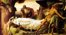 Overwhelmed with sadness, Admète falls into the arms of his entourage. A party of sad men and another of women carrying flowers and all the ornaments which had adorned Alceste, enter and hold a funeral ceremony. A hysterical pain takes hold of the crowd: Some rend their garments, others tear their hair, and each person breaks, at the foot of the image of Alceste, the ornaments he carries.