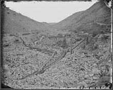 Alder Gulch (alternatively called Alder Creek) is a place in the Ruby River valley, in the U.S. state of Montana, where gold was discovered on May 26, 1863, by William Fairweather and a group of men including Barney Hughes, Thomas Cover, Henry Rodgers, Henry Edgar and Bill Sweeney who were returning to the gold fields of Grasshopper Creek, Bannack, Montana. They were on their way to Yellowstone Country from Bannack but were waylaid by a band of Crow Indians. After being ordered out of Crow hunting grounds, they crossed the East Slope of the Tobacco Root Mountains and camped for the night in Elk Park, where William "Bill" Fairweather and Henry Edgar discovered gold, while the remaining party was out hunting for meat. Agreeing to keep the new discovery quiet the group of miners returned to the town of Bannack for supplies. However, word leaked out about the new strike, and miners followed the Fairweather party out of town. The party stopped at the Point of Rocks, part way between Bannack and Alder Gulch, and established the Fairweather Mining District in a miners meeting. It was agreed that the discoverers were entitled to two claims and first choice. The first stampede of miners reached Alder Gulch June 6, 1863, and the population swelled to over 10,000 in less than 3 months. The "Fourteen Mile City" ran the length of the gulch, and included the towns of Junction City, Adobe Town, Nevada City, Central City, Virginia City, Montana, Bear Town, Highland, Pine Grove French Town, Hungry Hollow, and Summit. Upon arrival the miners lived in brush wickiups, dugouts and under overhanging rocks until cabins could be built. The first structure built in Virginia City was the Mechanical Bakery. Virginia City, and Nevada City were the centers of commerce during the height of the Alder Gulch gold rush. In the first year the area had over 10,000 people living there. Montana Territory was established in May 1864, and the first territorial capital was Bannack. The capital then moved to Virginia City, where it remained until 1875. The Alder Gulch diggings were the richest gold placer deposits ever discovered, and in three years $30,000,000 was taken from them, with $10,000,000 taken out in the first year. Nowadays, except during summertime, the streets of Virginia City are usually quiet and relatively few visitors find their way to the 16 ton granite monument that marks the spot of that incredible discovery of May 26, 1863.