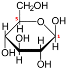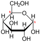 Hexoses exist in two forms, open-chain or cyclic, that easily convert into each other in aqueous solutions.[4] The open-chain form of a hexose, which usually is favored in solutions, has the general structure H–(CHOH)n−1–C(=O)–(CHOH)4−n–H, where n is 1, 2, or 3. Namely, five of the carbons have one hydroxyl functional group (–OH) each, connected by a single bond, and one has an oxo group (=O), forming a carbonyl group (C=O). The remaining bonds of the carbon atoms are satisfied by seven hydrogen atoms. The carbons are commonly numbered 1 to 6 starting at the end closest to the carbonyl.
