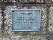 Alexander Cruden was born in Aberdeen in Scotland (baptised on 8 June 1699, St. Nicholas Kirk, Aberdeen, according to recent research) and was educated at Aberdeen Grammar School and Marischal College, University of Aberdeen, and became an excellent Latin, Greek and Biblical scholar.