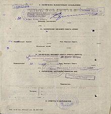 As an escaped POW, Pechersky was conscripted into a special penal battalions, conforming to Stalin's Order No. 270 and was sent to the front to fight German forces in some of the toughest engagements of the war.[24] Pechersky's battalion commander, Major Andreev, was so shocked by his description of Sobibor that he permitted Pechersky to go to Moscow and speak to the Commission of Inquiry of the Crimes of Fascist-German Aggressors and their Accomplices. The Commission listened to Pechersky and published the report Uprising in Sobibor based on his testimony.[25] This report was included in the Black Book, one of the first comprehensive compilations about the Holocaust, written by Vasily Grossman and Ilya Ehrenburg.