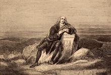 His name can also be spelled Peathine or Pethein.[7] He was born in Auchencloich in the parish of Sorn about 1626.[8] He was the son of a small proprietor. He was possibly the Alexander Peden who was the restored heir of his grandfather in Hillhead of Sorn, 16 March 1648, and on the same day heir of Auchinlonfuird. Of his early training there is no clear record, but he may have attended the parish school of Mauchline, and was a student at Glasgow University from 1643 to 1648. For a time he acted as schoolmaster, precentor, and session-clerk at Tarbolton, and, according to Wodrow, was employed in a similar capacity at Fenwick. As he was about to receive license from the Presbytery of Ayr, an accusation of immorality was raised against him, but was found to be false. In 1659 he was ordained to this charge, and was deprived by Act of Parliament 11 June, and Decreet of Privy Council 1 October 1662. When he preached his farewell sermon he is said to have occupied the pulpit till nightfall, and on leaving it, to have knocked three times on the door with his Bible, saying, "I arrest thee in my Master's name, that none enter thee but such as come by the door, as I have done." Following his ejectment Peden became perhaps the most celebrated field preacher of his time. He wandered all over the South of Scotland, obtaining by his figurative and oracular style of address and his supposed prophetic gifts an extraordinary influence over the people, which was further increased by his hardships, perils, and numerous hairbreadth escapes.