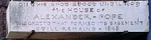 Pope lived in his parents' house in Mawson Row, Chiswick, between 1716 and 1719; the red brick building is now the Mawson Arms, commemorating him with a blue plaque.[12]