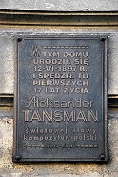 Tansman was born and raised in the Polish city of Lodz during the era when Poland did not exist as an independent state, being part of Tsarist Russia. His parents were both natives of Pinsk. His father Moshe Tancman / Tantzman (1868-1908) died when Alexander was 10 and his mother Hannah (nee Hurwicz / Gourvitch, 1872-1935) reared him and his older sister Teresa (born in 1895) alone.[3][4]