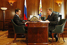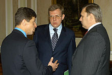 Kudrin served as finance minister from May 2000 to September 2011.[13] Kudrin belongs to the group of so-called "St Petersburg economists"—liberal reformers who worked with Putin during his time in the St Petersburg administration—one of the three main informal groups during Putin's presidency.[14] John P. Willerton regards Kudrin and German Gref as the leading intellectual forces in crafting of the economic policies of the Putin and Medvedev presidencies.[15] According to Simon Pirani, Kudrin balanced the influence of the siloviki in the government with a financial sobriety.[16]