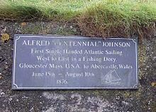 Alfred "Centennial" Johnson (1846–1927) was a Danish-born fisherman from Gloucester, Massachusetts. In 1876, in a 20-foot (6.1 m) sailing dory, he made the first recorded single-handed crossing of the Atlantic Ocean, landing at Abercastle in west Wales as a celebration of the first centennial of the United States.[1] Local author Rob Morris has also written a book about the crossing called Alfred "Centennial" Johnson.[1]