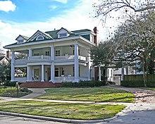 Finn established a robust practice for residential architecture, especially in some wealthy Houston subdivisions such as Courtlandt Place, Montrose, and Shadyside. His first work in the Rossmoyne subdivision was the Sterling-Berry House (NHRP-listed), which he completed in 1916 and enhanced with a large portico in 1919.[12] He designed a new house on nearby Montrose Boulevard for Henry H. Dickson, President of the Dickson Wheel Car Company (1917).[13] In the Houston Heights, his early work included the Woodward House (NRHP-listed), which he completed in 1918.[14] In 1920, he designed a home for Earl K. Wharton in the wealthy enclave of Shadyside.[15] Already known in the Courtlandt Place subdivision through his work on the A.S. Cleveland House and James L. Autry House while under the employ of Sanguinet & Staats, Finn moved and remodeled an 1890 Victorian house for Sarah Brashear Jones (Jones-Hunt House, NRHP-listed) in 1920.[3] Other homes in Houston designed by Finn include the Sid Westheimer house (1920), and one for oil mogul, Walter Fondren (1923).[2] He designed the Benjamin Apartments (NRHP-listed), a synthesis of Renaissance Revival style and Arts and Crafts principles.[16] Perhaps Finn's most ambitious residential project was the Ross Sterling House in Bay Ridge Park near Morgan's Point, completed in 1928. He and Robert Smallwood designed a two-and-one-half story house overlooking the Houston Ship Channel with a bay-side portico design based on the south facade of the White House.[17] The next year Finn's office completed a commission for William Lewis Moody III. Smallwood designed the Georgian neo-classical home in Galveston's Cedar Lawn Subdivision, and this neighborhood is now NRHP-listed.[18]