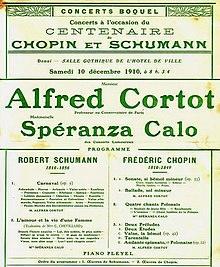 Alfred Denis Cortot (also Cortôt, French-European spelling) (pronounced [core-TOE]) (26 September 1877 – 15 June 1962) was a French pianist, conductor, and teacher who was one of the most renowned classical musicians of the 20th century. He was especially valued for his poetic insight into Romantic piano works, particularly those of Chopin, Saint-Saëns and Schumann.[1]