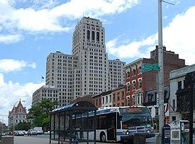 The Alfred E. Smith Building, known officially as the Alfred E. Smith State Office Building and sometimes called simply the Smith Building, is a structure located in downtown Albany, New York across the street from the New York State Capitol and One Commerce Plaza. The building's namesake, Alfred Emmanuel Smith, was a four-term governor of New York and the Democratic Party's nomination for the 1928 presidential election. The Art Deco skyscraper has 34 stories and at 388 feet (118 m) is Albany's second tallest structure (after the Erastus Corning Tower). Completed in 1928, it houses offices of the New York State government. Built originally with an observation deck on the 31st floor, the 350-foot-high (110 m) open-air deck was closed in 1976 when the 589-foot-tall (180 m) 42nd floor enclosed Corning Tower Observation Deck was opened.[1] An extensive renovation of the building began in 2002. This modernization, which cost at least $103 million, is now finished.