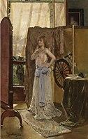 Stevens's work was shown publicly for the first time in 1851, when three of his paintings were admitted to the Brussels Salon. He was awarded a third-class medal at the Paris Salon in 1853, and a second-class medal at the Universal Exposition in Paris in 1855.[3] His Ce qu'on appelle le vagabondage [What is called vagrancy] (Musée d'Orsay, Paris) attracted the attention of Napoleon III who, as a result of the scene in the picture, ordered that soldiers no longer be used to pick up the poor from the streets.[4] Two other paintings he exhibited at the Salon in Antwerp that year, Chez soi or At Home (present location unknown) and The Painter and his Model (Walters Art Museum, Baltimore), introduced subjects from "la vie moderne" for which he became known: an elegant young woman in contemporary dress and the artist in his studio. In 1857, Stevens made his first important sale to a private collector, when Consolation was bought for a rumored 6,000 francs by the Berlin collector and dealer Ravéné. At the same time, he and his brother were becoming part of the art world of Paris, meeting people such as the Goncourt brothers, Théophile Gautier, and Alexandre Dumas at the salons of Princess Mathilde as well as popular cafés. In 1858, Stevens married Marie Blanc, who came from a rich Belgian family and old friends of the Stevens's. Eugène Delacroix was a witness at the ceremony.[5]