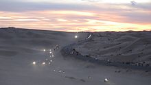 Environmental protection groups (notably the Center for Biological Diversity[3]) and off-highway vehicle advocacy groups (notably the American Sand Association) have filed numerous petitions and lawsuits to either restrict or re-open vehicular access to the dunes. Most of the dunes located north of State Route 78 are off-limits to vehicular traffic due to designation as the North Algodones Dunes Wilderness. The federal government protected these 25,818 acres (10,448 ha) in the early 1980s and closed them to vehicles as part of the 1994 California Desert Protection Act (Public Law 103-433). Much of the area south of this road remains open for off-highway vehicle use, though a lawsuit in 2000 closed over 49,000 acres (20,000 ha) to vehicular access, leaving about 40% of the recreation area open to vehicles. In 2014, a significant portion (approximately 40,000 acres) of this area was re-opened for vehicular use. It is the largest sand dunes open to off-highway vehicle use in the United States.[4] The site's large sand dunes are a preferred terrain for many off-road vehicle owners. Motorcycles, sandrails, ATVs, and 4-wheel-drive vehicles are commonly driven across the dunes. Open camping is permitted, and on major winter holidays, as many as 150,000 people can visit in a single weekend.[5] These recreationalists bring an economic boom during the cooler months to the nearby towns of Brawley, California, Yuma, Arizona and El Centro, California.