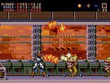 Alien Soldier is a side-scrolling run and gun video game in which the player controls the main character, Epsilon-Eagle, through 25 stages and 26 bosses.[1][2] The gameplay has been compared heavily to Gunstar Heroes; however, putting a much larger emphasis on boss fights, and lacking any 2-player option.[1] The stages are notably short, populated with weak enemies to serve as downtime between the more difficult boss battles. There are two difficulties in the game, "supereasy" and "superhard". Enemies on the hard setting are only slightly more difficult; however, there are no passwords or unlimited continues as in the easy mode.[3]