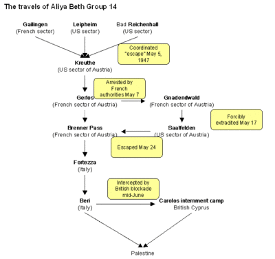 - ^ a b c d e f g h i "Immigration to Israel: Aliyah Bet (1939-1948)". Jewish Virtual Library. American–Israeli Cooperative Enterprise (AICE). 2017. Archived from the original on 1 November 2017. Retrieved 12 October 2020.