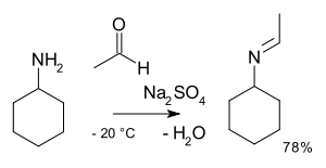 Alkylimino-de-oxo-bisubstitution in organic chemistry is the organic reaction of carbonyl compounds with amines to imines.[2] The reaction name is based on the IUPAC Nomenclature for Transformations. The reaction is acid catalyzed and the reaction type is nucleophilic addition of the amine to the carbonyl compound followed by transfer of a proton from nitrogen to oxygen to a stable hemiaminal or carbinolamine. With primary amines water is lost in an elimination reaction to an imine. With aryl amines especially stable Schiff bases are formed.