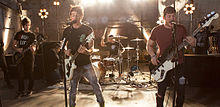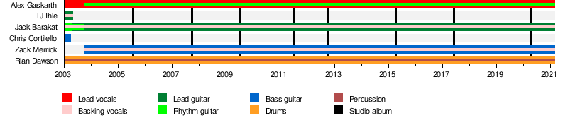 All Time Low is an American rock[2] band from Towson, Maryland, formed in 2003. The band consists of lead vocalist and rhythm guitarist Alex Gaskarth, lead guitarist Jack Barakat, bassist and backing vocalist Zack Merrick and drummer Rian Dawson. The band's name is taken from lyrics in the song "Head on Collision" by New Found Glory.[3][4] The band consistently tours year-long, has headlined numerous tours, and has appeared at music festivals including Warped Tour, Reading and Leeds and Soundwave.