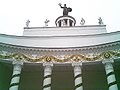 The most memorable feature of the exhibition site was the Worker and Kolkhoz Woman (Rabochiy i kolkhoznitsa) statue, featuring the gigantic figures of a man and woman holding together the famous "hammer and sickle". The sculpture, which reaches 25 meters toward the sky, was designed by Vera Mukhina and originally crowned the 35-meter-tall Soviet pavilion at the Paris Exposition Internationale des Arts et Techniques dans la Vie Moderne (1937). The statue featured on a logo of Mosfilm, Russia's largest movie studio.