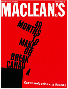 1962 was another busy year for Fleming. He designed a logo for the Montreal Trust Company; letterhead for Hawker Siddeley Canada; graphics and the logo for Toronto's Malton Airport (architect John B. Parkin); all signage, monumental lettering, and the foundation stone for Massey College at the University of Toronto (architect Ron Thom); annual reports and invitations; and much more. But in November 1962, he left C&B in order to become art director at Maclean's magazine. After a tumultuous nine months there, during which Fleming radically redesigned the look of the magazine, he was hired as executive art director at MacLaren Advertising Company Ltd. Its clients included General Electric, General Motors, Hockey Night in Canada, Imperial Oil, and Lever Brothers. That same year Fleming was commissioned to design a new logo for Ontario Hydro (launched 1965), as well as the crest, letterhead, and other related materials for the new Trent University in Peterborough, Ontario (architect Ron Thom). In April 1963, Allan and Nancy's third child, Susannah, was born.