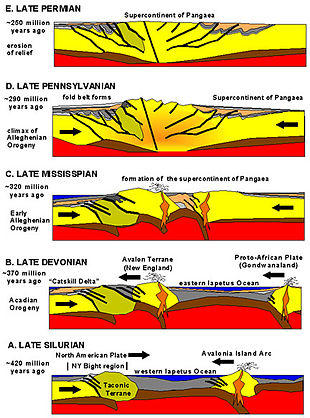 The Alleghanian orogeny occurred approximately 325 million to 260 million years ago [1] over at least five deformation events [2] in the Carboniferous to Permian period. The orogeny was caused by Africa colliding with North America. At the time, these continents did not exist in their current forms: North America was part of the Euramerica super-continent, while Africa was part of Gondwana. This collision formed the super-continent Pangaea, which contained all major continental land masses. The collision provoked the orogeny: it exerted massive stress on what is today the Eastern Seaboard of North America, forming a wide and high mountain chain.[3] Evidence for the Alleghanian orogeny stretches for many hundreds of miles on the surface from Alabama to New Jersey and can be traced further subsurface to the southwest. In the north, the Alleghanian deformation extends northeast to Newfoundland. Subsequent erosion wore down the mountain chain and spread sediments both to the east and to the west.