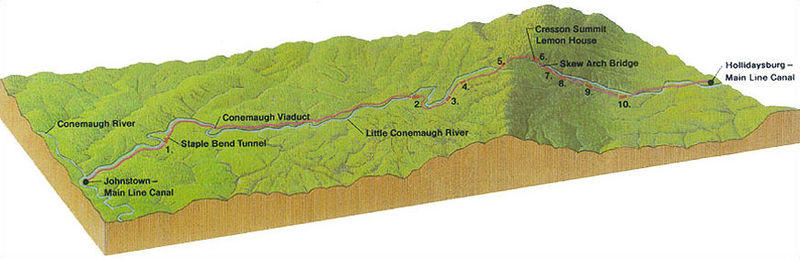 The railroad was authorized as part of the Main Line of Public Works legislation in 1824. It had five inclines on either side of the drainage divide running athwart the ridge line from Blair Gap through along the kinked saddle at the summit into Cresson, Pennsylvania. The endpoints connected to the Canal at Johnstown on the west through the relative flats to Hollidaysburg on the east. The Railroad utilized cleverly designed wheeled barges to ride a narrow-gauge rail track with steam-powered stationary engines lifting the vehicles. The roadbed of the railroad did not incline monotonically upwards, but rose in relatively long, saw-toothed stretches of slightly-sloped flat terrain suitable to animal powered towing, alternating with steep cable railway inclined planes using static steam engine powered windlasses, similar to mechanisms of modern ski lifts.
