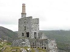 Three ruined Cornish engine houses are visible from Allihies. The most visually prominent is the Mountain Mine man engine house, located on the skyline above the village, and installed by the noted Cornish engineers Michael Loam and Son in 1862.