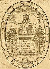 The earliest documented use of the term to refer to a university in an English-speaking country is in 1600, when the University of Cambridge printer, John Legate, began using an emblem for the university's press.[8][9] The device's first-known appearance is on the title-page of William Perkins' A Golden Chain, where the Latin phrase Alma Mater Cantabrigia ("nourishing mother Cambridge") is inscribed on a pedestal bearing a nude, lactating woman wearing a mural crown.[10][11] In English etymological reference works, the first university-related usage is often cited in 1710, when an academic mother figure is mentioned in a remembrance of Henry More by Richard Ward.[12][13]