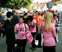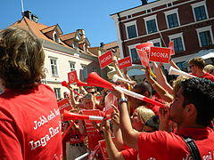 Almedalen Week is an annual event taking place in week 27 in and around Almedalen, a park in the city of Visby.[13] It is coordinated by Gotland Municipality and the cost of the different activities is carried by the organization responsible for it.[14] Each day of the week is dedicated to one of the political parties represented in the Riksdag, on a rotating schedule.[15] In 2011, the number of days were extended to eight since there were then eight parties in the Riksdag.[8] A number of other lobbyists, organizations, companies and representatives from municipalities and countries are also present.[15]