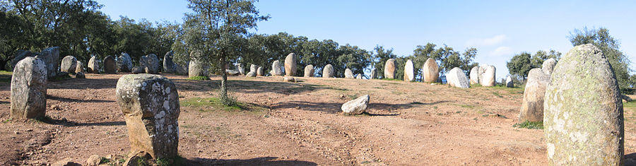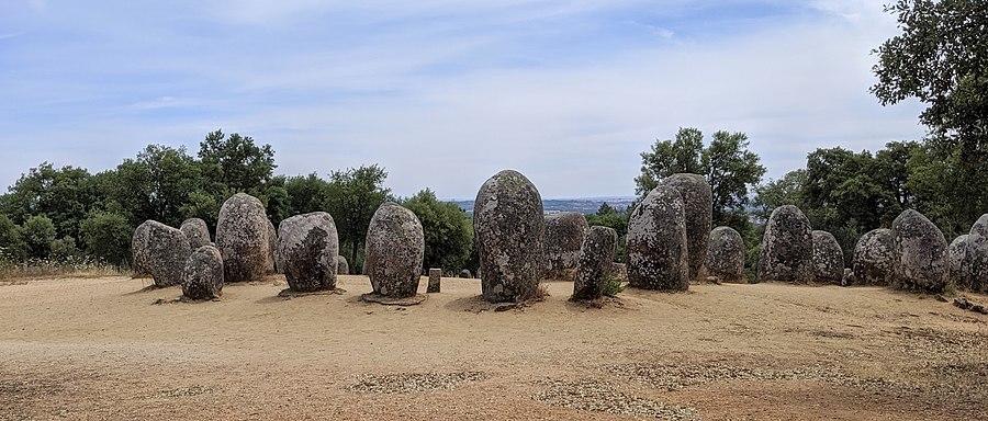 The Cromlech of the Almendres (Portuguese: Cromeleque dos Almendres/Cromeleque na Herdade dos Almendres) is a megalithic complex (commonly known as the Almendres Cromlech), located 4.5 road km WSW of the village of Nossa Senhora de Guadalupe, in the civil parish of Nossa Senhora da Tourega e Nossa Senhora de Guadalupe, municipality of Évora, in the Portuguese Alentejo. The largest existing group of structured menhirs in the Iberian Peninsula (and one of the largest in Europe), this archaeological site consists of several megalithic structures: cromlechs and menhir stones, that belong to the so-called "megalithic universe of Évora", with clear parallels to other cromlechs in Evora District, such as Portela Mogos and the Vale Maria do Meio Cromlech.[1]