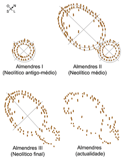 The complex, organized in a circular pattern, is marked by a forest of about 95 granite monoliths, deposited in small groups.[1] The older (Early Neolithic) monoliths are formed as two or three concentric circles of smaller monoliths in the western part of the complex, while the Middle Neolithic structures consist of two ellipses (irregular but concentric) and large menhirs. In the Late Neolithic phase the earlier constructions suffered modifications, transforming it into a site for social or religious rituals.[5] Ninety-two of the menhirs form two grounds, which were built and oriented to different directions associated with the Equinox.[5]