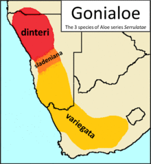 G. variegata was formerly part of the Serrulatae series of very closely related Aloe species, together with Aloe dinteri and Aloe sladeniana. Recent phylogenetic studies have shown these three species to possibly constitute an entirely separate genus, with the name Gonialoe. While this species looks rather similar to its two sister species, it can easily be distinguished from them by its shorter, stouter inflorescence with larger pink flowers.[2][3]