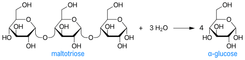 Alpha-glucosidase hydrolyzes terminal non-reducing (1→4)-linked alpha-glucose residues to release a single alpha-glucose molecule.[7] Alpha-glucosidase is a carbohydrate-hydrolase that releases alpha-glucose as opposed to beta-glucose. Beta-glucose residues can be released by glucoamylase, a functionally similar enzyme. The substrate selectivity of alpha-glucosidase is due to subsite affinities of the enzyme's active site.[8] Two proposed mechanisms include a nucleophilic displacement and an oxocarbenium ion intermediate.[8]