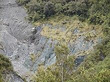 Uplift on the Alpine Fault has led to the exposure of deep metamorphic rocks near the fault within the Southern Alps. This includes mylonites and the Alpine Schist, which increases in metamorphic grade towards the fault. The eroded material has formed the Canterbury Plains.[5] The Alpine Fault is not a single structure but often splits into pure strike-slip and dip-slip components.[6][7] Also near the surface the fault can have multiple rupture zones.[2]