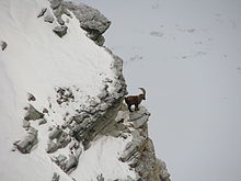 An excellent climber, its preferred habitat is the rocky region along the snow line above alpine forests, where it occupies steep, rough terrain at elevations of 1,800 to 3,300 m (5,900 to 10,800 ft).[6] Alpine ibex are typically absent from woodland areas,[2] although adult males in densely populated areas may stay in larch and mixed larch-spruce woodland if no snow has fallen.[7] Males spend the winter in coniferous forests.[2] For most of the year, males and females occupy different habitats.[8] Females rely on steep terrain more so than males.[9] Males use lowland meadows during the spring, which is when snow melts and green grass appears.[9] They then climb to alpine meadows during the summer.[7] When winter arrives, both sexes move to steep, rocky slopes that amass little snow.[10] They prefer slopes of 30–45° and use small caves and overhangs for shelter.[11] Home ranges are highly variable, depending on the availability of resources, and vary in size throughout the year. Figures from 180 to 2,800 ha (0.69 to 10.81 sq mi) have been recorded.[2][10] Home ranges tend to be largest during summer and autumn, smallest in winter, and intermediate in spring.[2] Female home ranges are usually smaller than those of males. Alpine ibex appear to have a low rate of predation and in Gran Paradiso typically die of age, starvation, or disease.[2]
